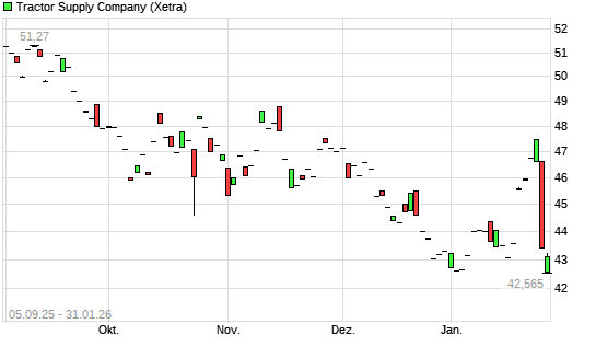 Mit dem Rücksetzer auf 41,73 EUR hat die Tractor Supply Company-Aktie (ISIN US8923561067) am 30.01.2026 ein neues 6-Monats-Tief erreicht und damit den Kurs vom 06.01.2026 eingestellt.Die ...weiterlesen