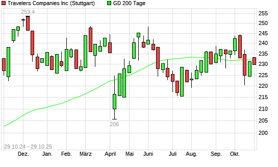 Mit dem Rücksetzer auf 231,10 EUR hat die Travelers Companies-Aktie am 28.10.2025 die 200-Tage-Linie nach unten gekreuzt.Die Travelers Companies-Aktie befand sich seit dem ...weiterlesen