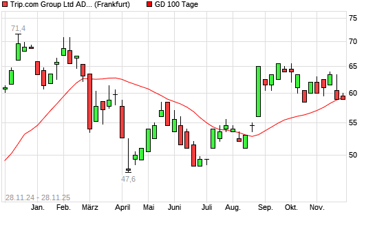 Mit dem Rücksetzer auf 59,00 EUR hat die Trip.com-Aktie am 27.11.2025 die 100-Tage-Linie nach unten gekreuzt.Die Trip.com-Aktie befindet sich seit dem 28.08.2025 im langfristigen Aufwärtstrend ...weiterlesen