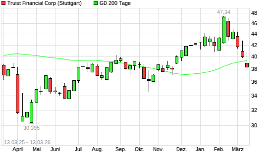 Mit dem Rücksetzer auf 39,13 EUR hat die Truist Financial-Aktie am 12.03.2026 die 200-Tage-Linie nach unten gekreuzt.Die Truist Financial-Aktie befand sich seit dem 31.10.2025 ...weiterlesen