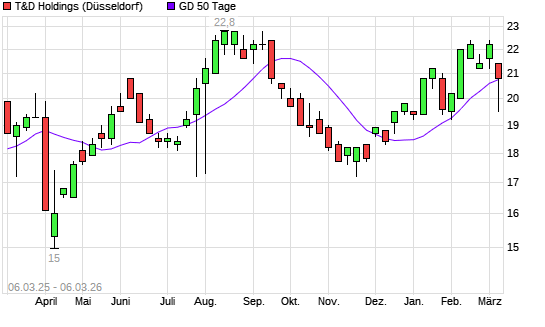 Mit dem Rücksetzer auf 20,40 EUR hat die T&D Holdings-Aktie am 05.03.2026 die 50-Tage-Linie nach unten gekreuzt.Die T&D Holdings-Aktie befindet sich seit dem 29.01.2026 ...weiterlesen