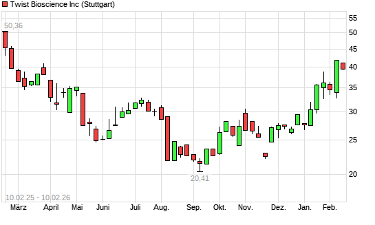 Mit dem Anstieg auf 41,26 EUR hat die Twist Bioscience-Aktie (ISIN US90184D1000) am 09.02.2026 ein neues 6-Monats-Hoch erreicht und damit den Kurs vom 05.02.2026 eingestellt.Die Twist Bioscience-Aktie ...weiterlesen