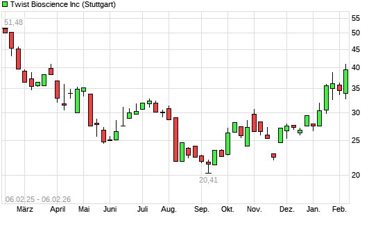 Mit dem Anstieg auf 40,28 EUR hat die Twist Bioscience-Aktie (ISIN US90184D1000) am 05.02.2026 ein neues 6-Monats-Hoch erreicht und damit den Kurs vom 03.02.2026 eingestellt.Die Twist Bioscience-Aktie ...weiterlesen