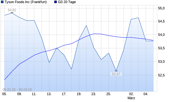 Mit dem Rücksetzer auf 53,77 EUR hat die Tyson Foods-Aktie am 04.03.2026 die 20-Tage-Linie nach unten gekreuzt.Die Tyson Foods-Aktie befindet sich seit dem 09.01.2026 im ...weiterlesen