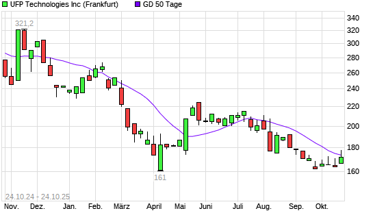Mit dem Anstieg auf 177,30 EUR hat die UFP Technologies-Aktie am 23.10.2025 die 50-Tage-Linie nach oben gekreuzt.Die UFP Technologies-Aktie befindet sich seit dem 10.02.2025 im langfristigen ...weiterlesen