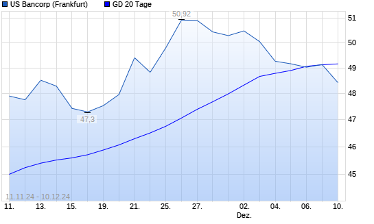 Mit dem Anstieg auf 49,13 EUR hat die US Bancorp-Aktie am 09.12.2024 die 20-Tage-Linie nach oben gekreuzt.Die US Bancorp-Aktie befindet sich seit dem 14.08.2024 im langfristigen Aufwärtstrend ...weiterlesen