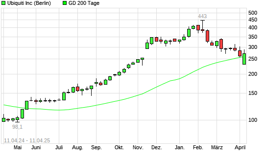 Mit dem Rücksetzer auf 263,00 EUR hat die Ubiquiti-Aktie am 10.04.2025 die 200-Tage-Linie nach unten gekreuzt.Die Ubiquiti-Aktie befand sich seit dem 09.04.2025 im langfristigen Aufwärtstrend ...weiterlesen