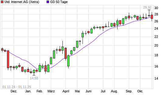 Mit dem Rücksetzer auf 26,66 EUR hat die United Internet-Aktie am 31.10.2025 die 50-Tage-Linie nach unten gekreuzt.Die United Internet-Aktie befindet sich seit dem 11.04.2025 im langfristigen ...weiterlesen