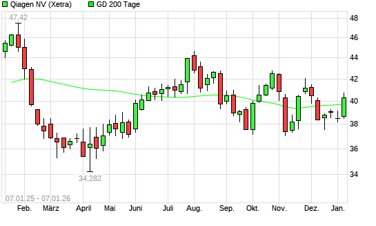 Mit dem Anstieg auf 39,81 EUR hat die Qiagen-Aktie am 06.01.2026 die 200-Tage-Linie nach oben gekreuzt.Die Qiagen-Aktie befand sich seit dem 10.12.2025 im langfristigen Abwärtstrend und hat ...weiterlesen