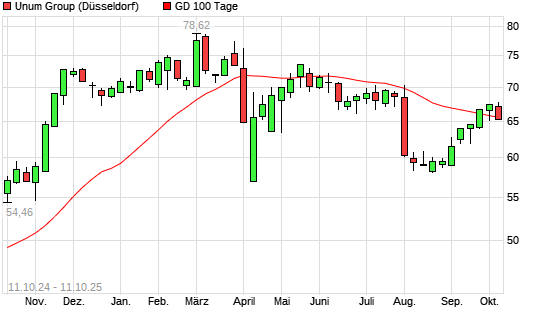 Mit dem Rücksetzer auf 65,32 EUR hat die Unum Group-Aktie am 10.10.2025 die 100-Tage-Linie nach unten gekreuzt.Die Unum Group-Aktie befindet sich seit dem 30.07.2025 im langfristigen Abwärtstrend ...weiterlesen