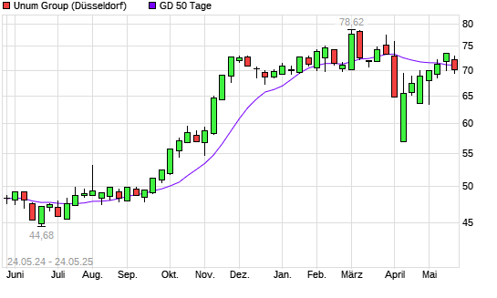 Mit dem Rücksetzer auf 70,26 EUR hat die Unum Group-Aktie am 23.05.2025 die 50-Tage-Linie nach unten gekreuzt.Die Unum Group-Aktie befindet sich seit dem 10.04.2025 im langfristigen Aufwärtstrend ...weiterlesen