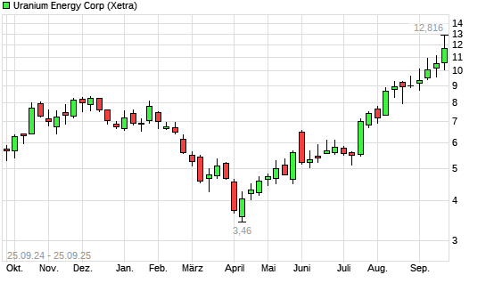 Mit dem Anstieg auf 11,95 EUR hat die Uranium Energy-Aktie (ISIN US9168961038) am 24.09.2025 ein neues All-Time-High erreicht und damit den Kurs vom 23.09.2025 eingestellt.Die Uranium Energy-Aktie ...weiterlesen