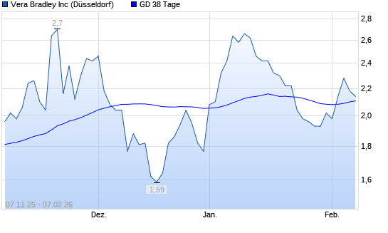 Mit dem Rücksetzer auf 2,14 EUR hat die VERA BRADLEY-Aktie am 06.02.2026 die 38-Tage-Linie nach unten gekreuzt.Die VERA BRADLEY-Aktie befindet sich seit dem 02.01.2026 im langfristigen ...weiterlesen