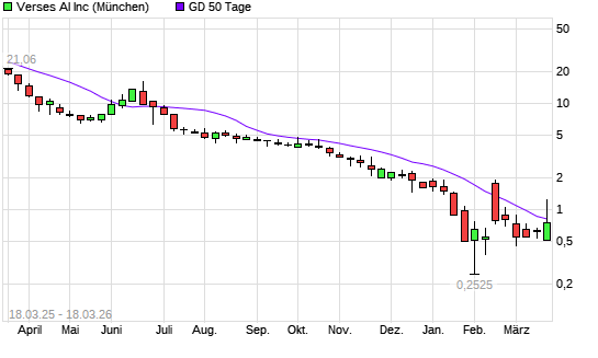 Mit dem Anstieg auf 1,22 EUR hat die VERSES TECHNOLOGIES CL.B-Aktie am 17.03.2026 die 50-Tage-Linie nach oben gekreuzt.Der Abstand zur 200-Tage-Linie beträgt aktuell -66,64%. ...weiterlesen