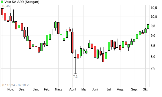Mit dem Anstieg auf 9,60 EUR hat die Vale ADR-Aktie (ISIN US91912E1055) am 06.10.2025 ein neues 6-Monats-Hoch erreicht und damit den Kurs vom 03.10.2025 eingestellt.Die Vale ADR-Aktie befindet ...weiterlesen