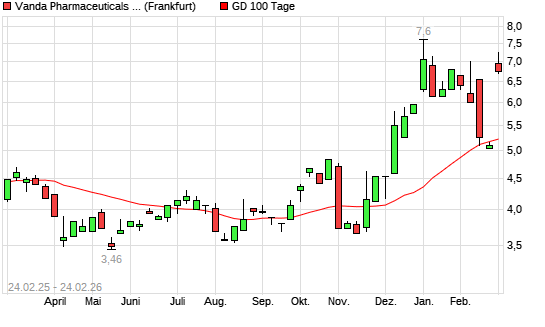 Mit dem Anstieg auf 6,90 EUR hat die Vanda Pharmaceuticals-Aktie am 23.02.2026 die 100-Tage-Linie nach oben gekreuzt.Die Vanda Pharmaceuticals-Aktie befindet sich seit dem 19.11.2025 ...weiterlesen