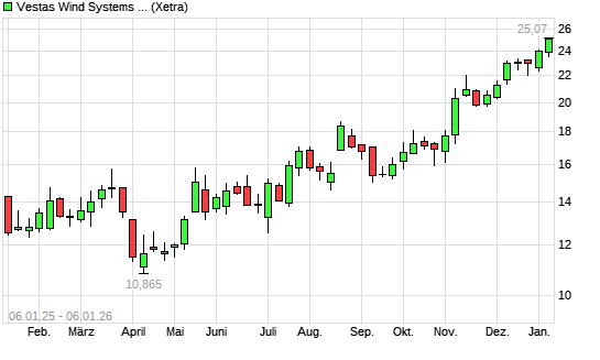 Mit dem Anstieg auf 24,81 EUR hat die Vestas-Aktie (ISIN DK0061539921) am 05.01.2026 ein neues 12-Monats-Hoch erreicht und damit den Kurs vom 02.01.2026 eingestellt.Die ...weiterlesen