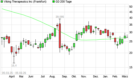 Mit dem Rücksetzer auf 26,95 EUR hat die Viking Therapeutics-Aktie am 04.03.2026 die 200-Tage-Linie nach unten gekreuzt.Die Viking Therapeutics-Aktie befand sich seit dem ...weiterlesen