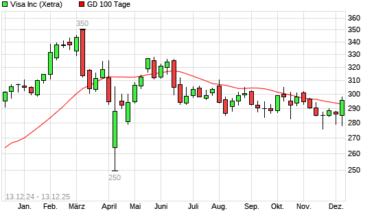 Mit dem Anstieg auf 295,50 EUR hat die Visa-Aktie am 12.12.2025 die 100-Tage-Linie nach oben gekreuzt.Die Visa-Aktie befindet sich seit dem 29.07.2025 im langfristigen Abwärtstrend und hat in ...weiterlesen