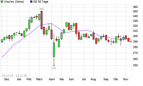 Mit dem Anstieg auf 293,95 EUR hat die Visa-Aktie am 12.11.2025 die 50-Tage-Linie nach oben gekreuzt.Die Visa-Aktie befindet sich seit dem 29.07.2025 im langfristigen Abwärtstrend und ...weiterlesen