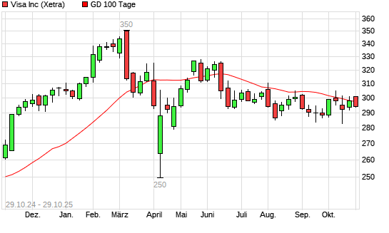 Mit dem Rücksetzer auf 295,60 EUR hat die Visa-Aktie am 28.10.2025 die 100-Tage-Linie nach unten gekreuzt.Die Visa-Aktie befindet sich seit dem 29.07.2025 im ...weiterlesen