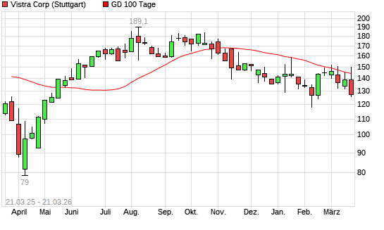 Mit dem Rücksetzer auf 127,95 EUR hat die Vistra Energy-Aktie am 20.03.2026 die 100-Tage-Linie nach unten gekreuzt.Die Vistra Energy-Aktie befindet sich seit dem 16.01.2026 ...weiterlesen