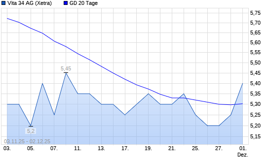 Mit dem Anstieg auf 5,30 EUR hat die Vita 34-Aktie am 01.12.2025 die 20-Tage-Linie nach oben gekreuzt.Die Vita 34-Aktie befindet sich seit dem 11.06.2025 im langfristigen Aufwärtstrend und hat ...weiterlesen
