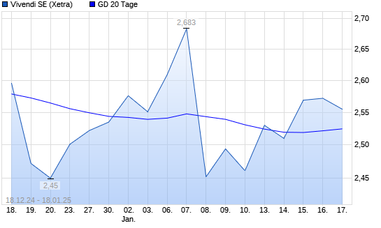 Mit dem Rücksetzer auf 2,49 EUR hat die Vivendi-Aktie am 17.01.2025 die 20-Tage-Linie nach unten gekreuzt.Die Vivendi-Aktie befindet sich seit dem 16.12.2024 im langfristigen Aufwärtstrend ...weiterlesen