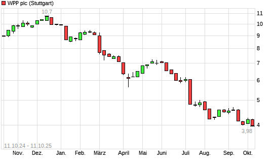 Mit dem Rücksetzer auf 3,96 EUR hat die WPP-Aktie (ISIN JE00B8KF9B49) am 10.10.2025 ein neues 10-Jahres-Tief erreicht und damit den Kurs vom 26.09.2025 eingestellt.Die WPP-Aktie befindet ...weiterlesen