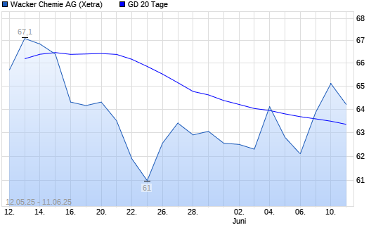 Mit dem Anstieg auf 64,10 EUR hat die Wacker Chemie-Aktie am 10.06.2025 die 20-Tage-Linie nach oben gekreuzt.Die Wacker Chemie-Aktie befindet sich seit dem 27.03.2025 im langfristigen Abwärtstrend ...weiterlesen