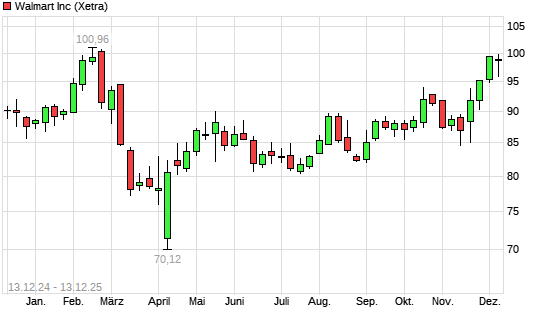 Mit dem Anstieg auf 99,04 EUR hat die Walmart-Aktie (ISIN US9311421039) am 12.12.2025 ein neues 6-Monats-Hoch erreicht und damit den Kurs vom 09.12.2025 eingestellt.Die Walmart-Aktie befindet ...weiterlesen