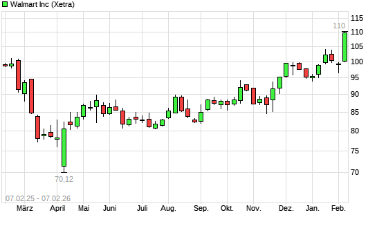 Mit dem Anstieg auf 111,06 EUR hat die Walmart-Aktie (ISIN US9311421039) am 06.02.2026 ein neues All-Time-High erreicht und damit den Kurs vom 04.02.2026 eingestellt.Die Walmart-Aktie befindet ...weiterlesen