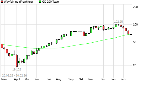 Mit dem Rücksetzer auf 67,44 EUR hat die Wayfair A-Aktie am 19.02.2026 die 200-Tage-Linie nach unten gekreuzt.Die Wayfair A-Aktie befand sich seit dem 17.02.2026 im ...weiterlesen