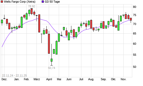 Mit dem Rücksetzer auf 71,26 EUR hat die Wells Fargo-Aktie am 21.11.2025 die 50-Tage-Linie nach unten gekreuzt.Die Wells Fargo-Aktie befindet sich seit dem 14.10.2025 im ...weiterlesen