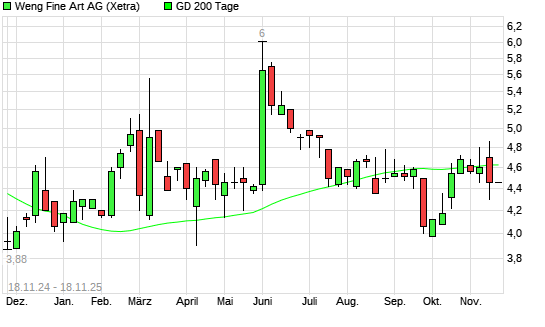 Mit dem Rücksetzer auf 4,32 EUR hat die Weng Fine Art-Aktie am 17.11.2025 die 200-Tage-Linie nach unten gekreuzt.Die Weng Fine Art-Aktie befand sich seit dem 13.11.2025 ...weiterlesen