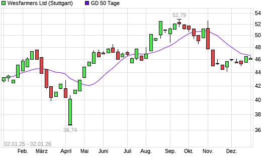 Mit dem Anstieg auf 46,32 EUR hat die Wesfarmers-Aktie am 08.01.2026 die 20-Tage-Linie nach oben gekreuzt.Die Wesfarmers-Aktie befindet sich seit dem 05.11.2025 im langfristigen Abwärtstrend ...weiterlesen