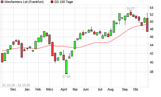 Mit dem Rücksetzer auf 48,66 EUR hat die Wesfarmers-Aktie am 30.10.2025 die 100-Tage-Linie nach unten gekreuzt.Die Wesfarmers-Aktie befindet sich seit dem 30.04.2025 im langfristigen Aufwärtstrend ...weiterlesen