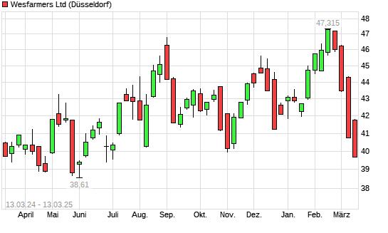Mit dem Rücksetzer auf 40,05 EUR hat die Wesfarmers-Aktie (ISIN AU000000WES1) am 12.03.2025 ein neues 6-Monats-Tief erreicht und damit den Kurs vom 01.11.2024 eingestellt.Die Wesfarmers-Aktie ...weiterlesen