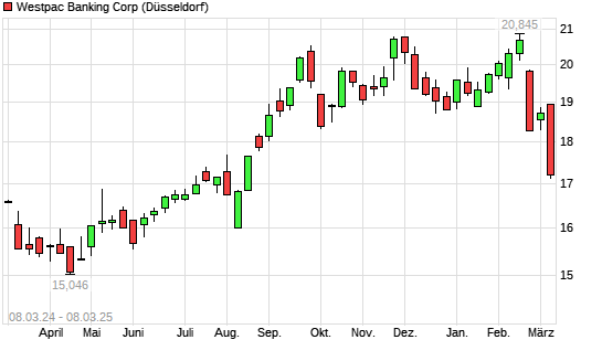Mit dem Rücksetzer auf 17,21 EUR hat die Westpac Banking-Aktie (ISIN AU000000WBC1) am 07.03.2025 ein neues 6-Monats-Tief erreicht und damit den Kurs vom 06.03.2025 eingestellt.Die Westpac ...weiterlesen