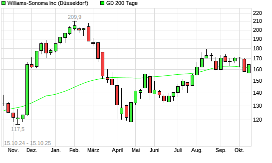 Mit dem Anstieg auf 161,85 EUR hat die Williams-Sonoma-Aktie am 14.10.2025 die 200-Tage-Linie nach oben gekreuzt.Die Williams-Sonoma-Aktie befand sich seit dem 13.10.2025 im langfristigen Abwärtstrend ...weiterlesen