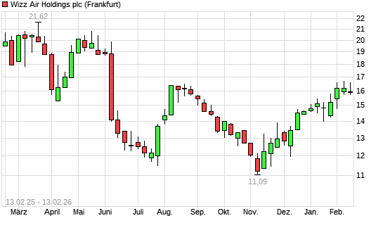 Mit dem Anstieg auf 16,61 EUR hat die Wizz Air Holdings-Aktie (ISIN JE00BN574F90) am 12.02.2026 ein neues 6-Monats-Hoch erreicht und damit den Kurs vom 19.08.2025 eingestellt.Die Wizz Air Holdings-Aktie ...weiterlesen