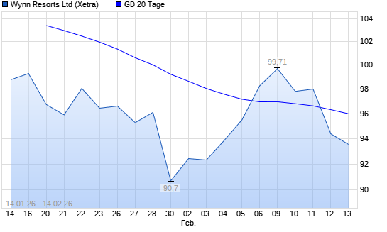 Mit dem Rücksetzer auf 85,83 EUR hat die Wynn Resorts-Aktie am 13.02.2026 die 20-Tage-Linie nach unten gekreuzt.Die Wynn Resorts-Aktie befindet sich seit dem 12.02.2026 im langfristigen ...weiterlesen