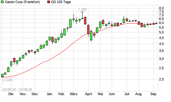Mit dem Anstieg auf 6,14 EUR hat die Xiaomi-Aktie am 09.09.2025 die 100-Tage-Linie nach oben gekreuzt.Die Xiaomi-Aktie befindet sich seit dem 08.08.2024 im langfristigen Aufwärtstrend und hat ...weiterlesen