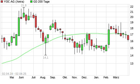 Mit dem Rücksetzer auf 16,30 EUR hat die YOC-Aktie am 01.04.2025 die 200-Tage-Linie nach unten gekreuzt.Die YOC-Aktie befand sich seit dem 27.03.2025 im langfristigen Aufwärtstrend und ...weiterlesen