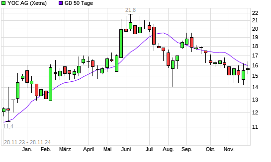 Mit dem Anstieg auf 15,80 EUR hat die YOC-Aktie am 27.11.2024 die 50-Tage-Linie nach oben gekreuzt.Die YOC-Aktie befindet sich seit dem 25.09.2024 im langfristigen Abwärtstrend und hat in diesem ...weiterlesen