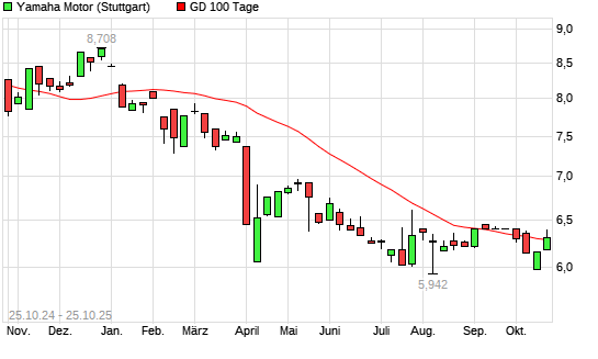 Mit dem Rücksetzer auf 6,27 EUR hat die Yamaha Motor-Aktie am 24.10.2025 die 100-Tage-Linie nach unten gekreuzt.Die Yamaha Motor-Aktie befindet sich seit dem 06.01.2025 ...weiterlesen