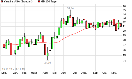 Mit dem Rücksetzer auf 31,08 EUR hat die Yara International-Aktie am 18.11.2025 die 100-Tage-Linie nach unten gekreuzt.Die Yara International-Aktie befindet sich seit dem ...weiterlesen