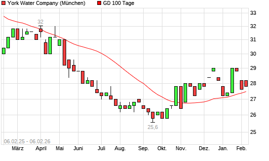 Mit dem Rücksetzer auf 27,40 EUR hat die York Water-Aktie am 04.02.2026 die 100-Tage-Linie nach unten gekreuzt.Die York Water-Aktie befindet sich seit dem 30.01.2026 im langfristigen Abwärtstrend ...weiterlesen