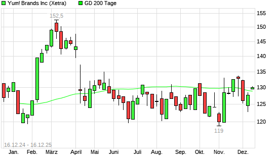 Mit dem Anstieg auf 128,50 EUR hat die Yum! Brands-Aktie am 15.12.2025 die 200-Tage-Linie nach oben gekreuzt.Die Yum! Brands-Aktie befand sich seit dem 02.12.2025 im langfristigen Aufwärtstrend ...weiterlesen