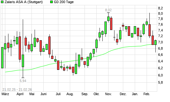 Mit dem Anstieg auf 7,06 EUR hat die Zalaris-Aktie am 20.02.2026 die 200-Tage-Linie nach oben gekreuzt.Die Zalaris-Aktie befand sich seit dem 13.02.2026 im langfristigen Abwärtstrend ...weiterlesen